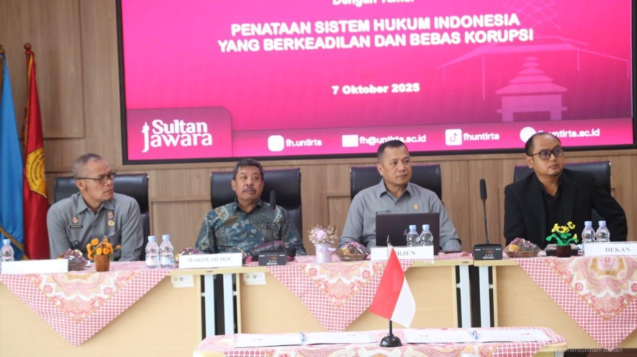 SERANG, Siberone.co.id – Fakultas Hukum Universitas Sultan Ageng Tirtayasa (FH Untirta) menggelar kuliah umum bertema “Penataan Sistem Hukum Indonesia yang Berkeadilan dan Bebas Korupsi”, Selasa (07/10/2025), sebagai bagian dari rangkaian Dies Natalis ke-44 Fakultas Hukum Untirta.