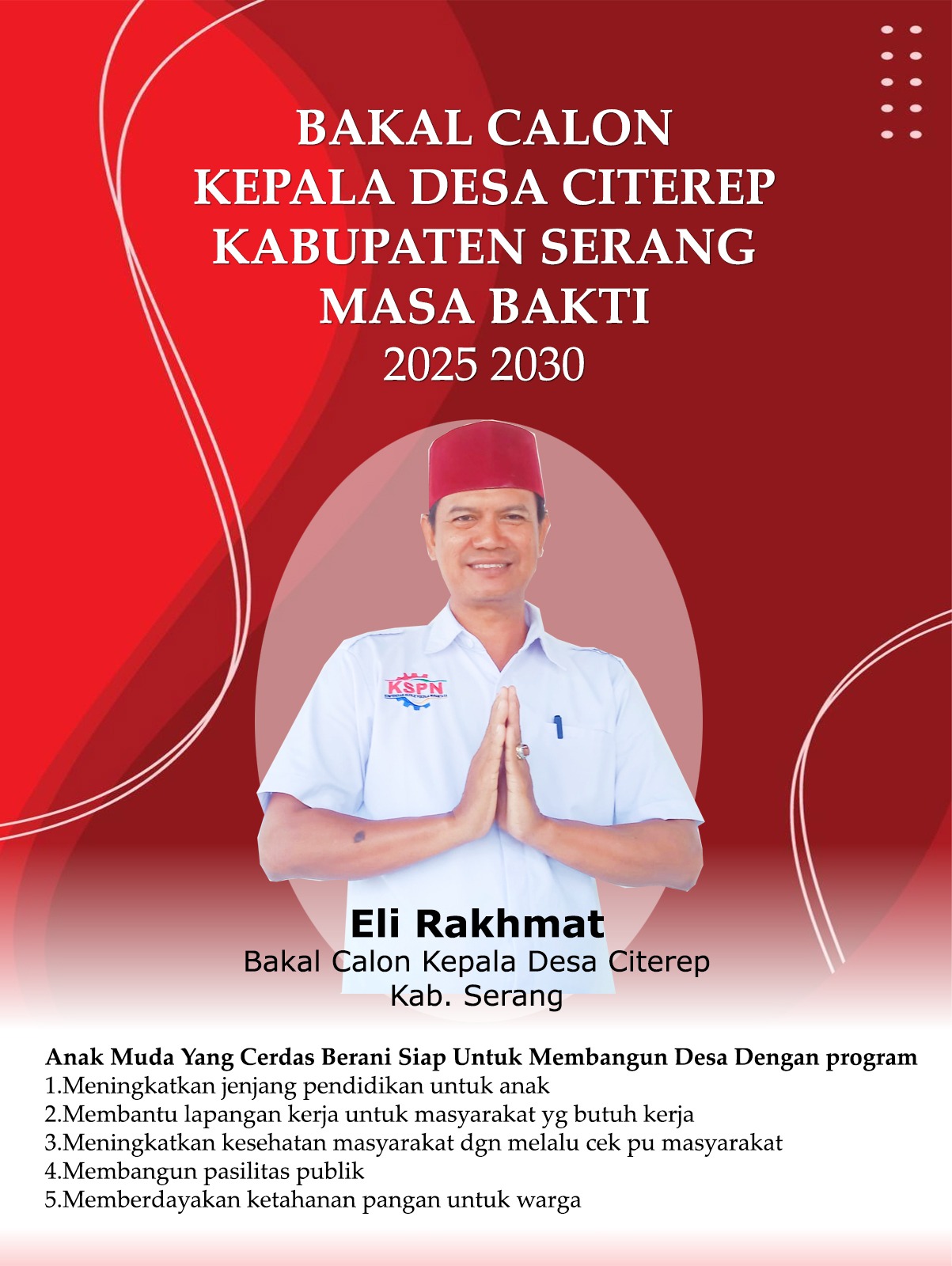 Serang, (siberone.co.id) – Eli Rakhmat, bakal calon Kepala Desa Citerep, Kecamatan Ciruas, Kabupaten Serang, Banten untuk periode 2025–2030, menyampaikan optimismenya dalam menghadapi kontestasi pemilihan kepala desa mendatang. Membawa semangat perubahan, Ely mengusung lima misi utama yang difokuskan pada pembangunan infrastruktur dan peningkatan kualitas sumber daya manusia (SDM).