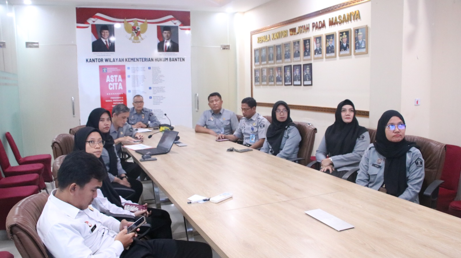 Turut mengikuti jajaran Kantor Wilayah Kementerian Hukum Banten secara virtual di Ruang Rapat Utama, Kakanwil Pagar Butar Butar, Kepala Bagian Tata Usaha dan Umum Agus Salim, beserta jajaran dan di tempat lain mengikuti Kepala Divisi Pelayanan Hukum Picesco Andika Tulus, pada Senin (09/03/2026).