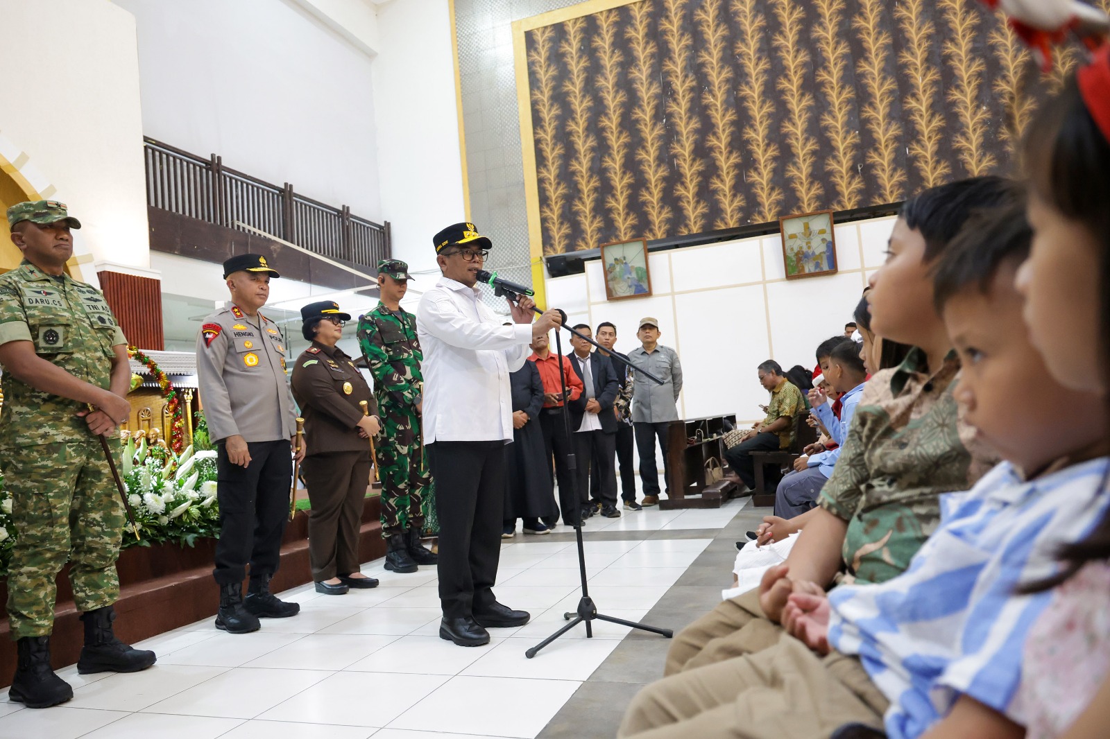 Dalam kunjungan tersebut, Gubernur Andra Soni menyapa dan menyampaikan ucapan selamat Natal secara langsung kepada para jemaat. Ia menegaskan komitmen pemerintah daerah dalam menjaga keharmonisan dan keamanan.