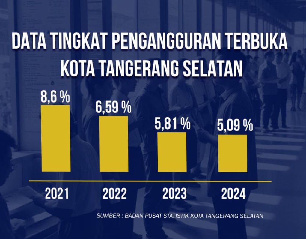 Berdasarkan data terbaru Badan Pusat Statistik (BPS), Tingkat Pengangguran Terbuka (TPT) di Tangsel pada 2024 turun menjadi 5,09 persen, dibandingkan 5,81 persen pada tahun sebelumnya.