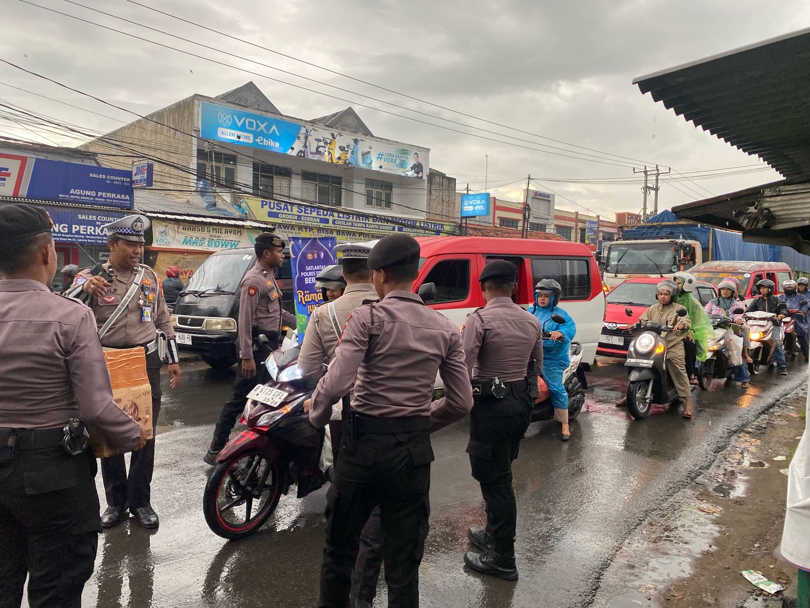 SERANG, (siberone.co.id) – Memeriahkan bulan suci Ramadhan, personel Satsamapta dan Satlantas Polres Serang membagikan menu buka puasa (takjil) kepada pengguna jalan di jalur arteri Serang – Jakarta di pangkalan ojek sentul kragilan, sabtu (08/03) petang.