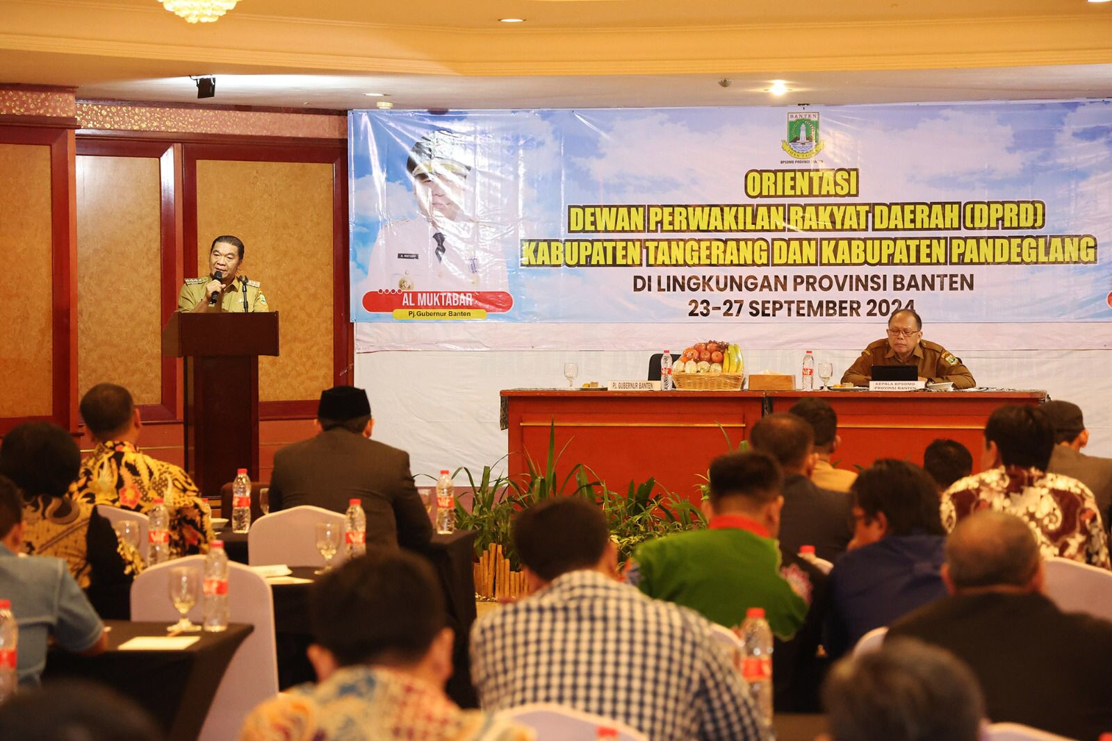 SERANG, (siberone.co.id) – Penjabat (Pj) Gubernur Banten Al Muktabar membuka orientasi anggota DPRD Kabupaten Tangerang dan DPRD Kabupaten Pandeglang di Ledian Hotel, Kota Serang, Selasa (24/9/2024). Orientasi untuk memahami ruang lingkup, fungsi, tugas dan kewenangan anggota DPRD. Orientasi juga untuk meningkatkan wawasan kebangsaan, meningkatkan integritas dan moralitas dalam mengimplementasikan kode etik untuk menjaga martabat, citra dan kredibilitas DPRD Kabupaten/Kota.