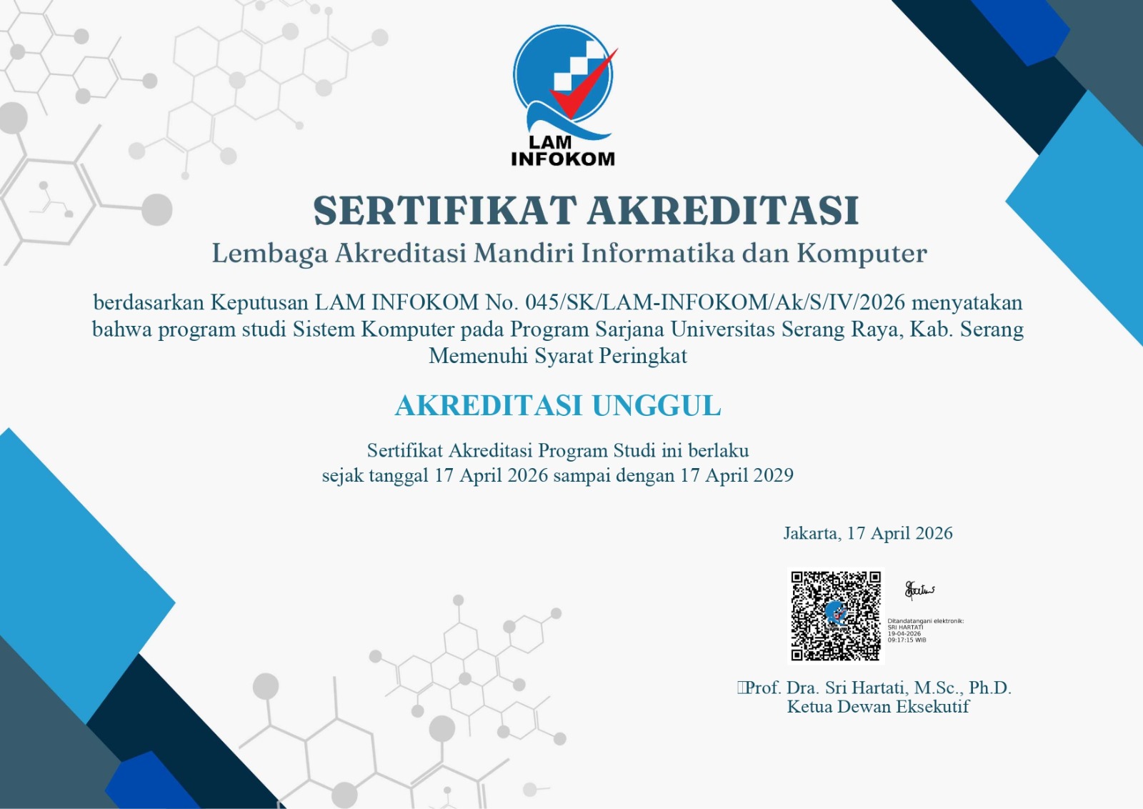 Akreditasi UNGGUL merupakan peringkat tertinggi dalam sistem akreditasi pendidikan tinggi di Indonesia, yang menunjukkan bahwa suatu program studi telah memenuhi standar mutu yang sangat baik dan berkelanjutan. Status ini berlaku selama tiga tahun, mulai 17 April 2026 hingga 17 April 2029.